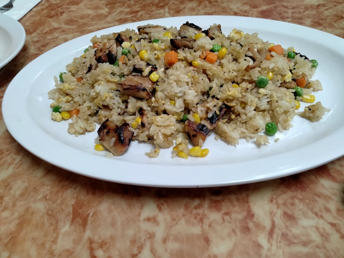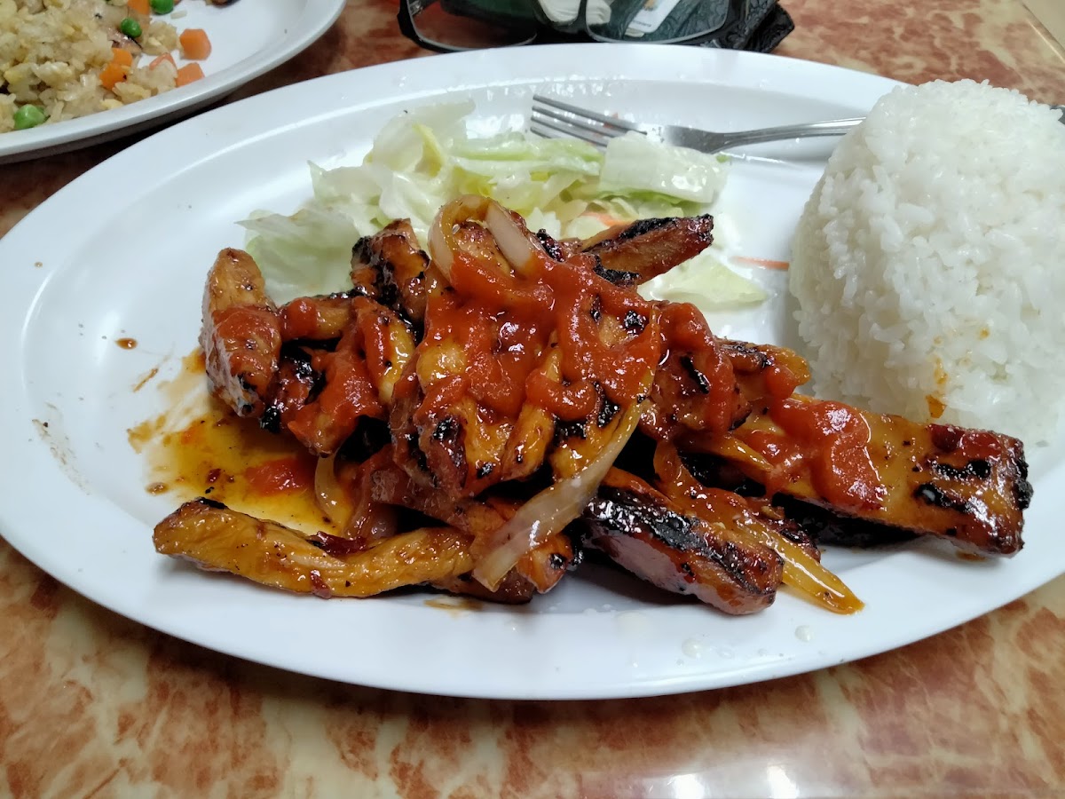 We really enjoy this place. Great portions with quality taste for the same standard price after tax you’ll find at most places in this area. You can see in the picture on the (left plate) chicken and pork that they give you the same amount of chicken as if you order just the chicken teriyaki as the (right plate) most places skimp on portions of combos. I moved the chicken so you could see the fried rice. Looks beautiful full of everything and tastes very good. I also ordered a side of steamed veggies which for my preference could have been cooked a bit longer but I’m happy with the amount of variety of veggies.